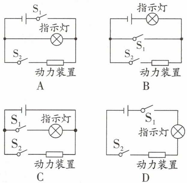 7. (2024九龙坡区模拟)如图所示是一款感应式垃圾桶,其工作原理如下:启动开关$S_1$闭合后,指示灯亮起,这时垃圾桶才能正常使用;扔垃圾时,只需将手伸到感应区上方,感应开关$S_2$自动闭合,动力装置工作,桶盖打开;手离开5秒后,感应开关$S_2$就会自动断开。下列电路图符合要求的是( )A. B. C. D.(