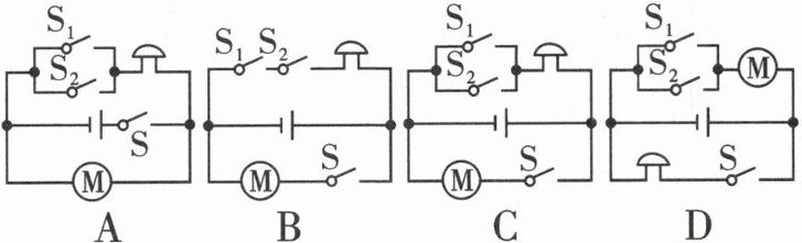 8. 公交车后门左右扶杆上各装有一个按钮开关(分别用$S_1、$$S_2$表示),当乘客按下任意一个开关时,电铃响起,提醒司机有乘客要下车;待车停稳后,司机按下控制电动机的开关S,后门打开,乘客才能下车。下列电路设计符合要求的是