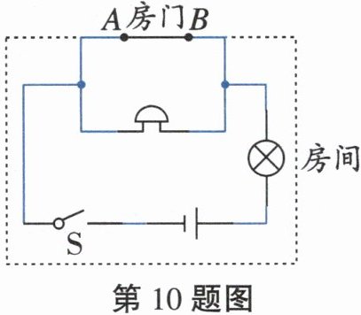 10. “创新”实验小组的同学要设计一个自动防盗报警电路。要求:晚间开关S闭合后,灯亮电铃不响;当房门被打开时,细导线AB被扯断,灯亮且电铃发声自动报警。请按要求连接如图所示的电路元件。(如图)_____
