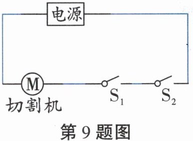 9. 电动切割机有两开关$S_1、$$S_2,$必须两手同时用力各压一个开关,切割机才会工作,最大限度保护操作人员。把图中各元件连成一个电路,使其能按上述要求工作。(如图)_____
