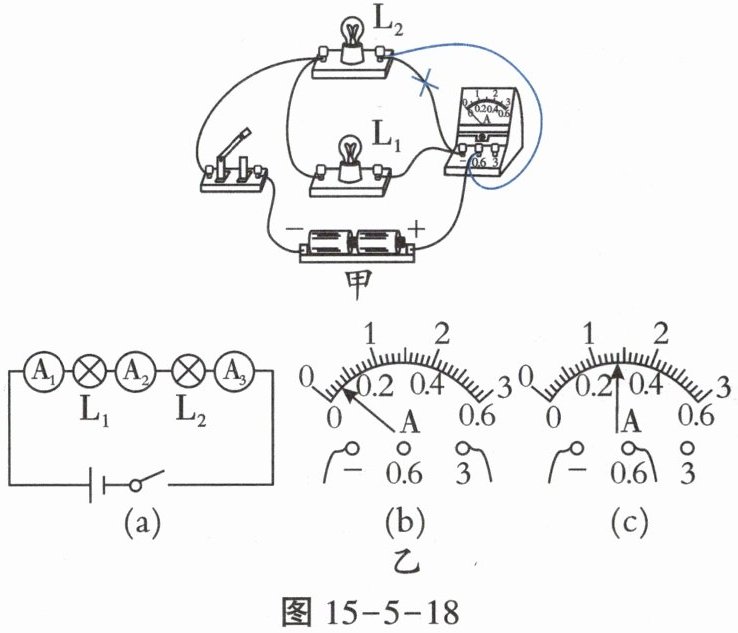 (2)小鲁同学在探究“串联电路的电流规律”时,他设计了如图乙(a)所示的电路图,并按照实验操作规范来完成实验探究。电流表A_1、A_2的示数如图乙(b)(c)所示,通过读数,小鲁发现两处电流大小分别为0.3A和 _____A,得出“串联电路中各处的电流不相等”的结论。造成他本次实验结论判断错误的原因是 _____。