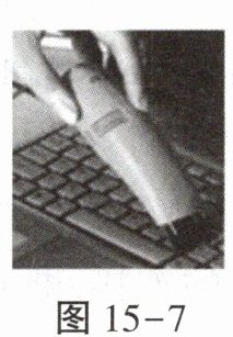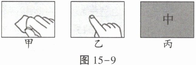 ,再用手指在塑料板上写了一个“中”字(如图15-9乙),然后在塑料板上均匀地撒上一层细小干木屑,将塑料板缓慢竖起,在重力作用下干木屑下落,“中”字就在塑料板上显现出来了(如图15-9丙),“中”字能显现出来的原因:一是摩擦过的塑料板能吸引轻小物体
