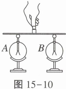 11.(2024九龙坡区月考)如图15-10所示,取两个相同的验电器A和B,使A带负电,B不带电,用带有绝缘手柄的金属棒把A和B连接起来会看到B的金属箔张开,验电器B带上了