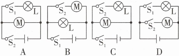 7.小明妈妈网购了一个电脑键盘清洁器,如图15-7所示。在使用过程中小明发现清洁器的工作状态由两个开关控制,开关$S_1$只控制小灯泡,开关$S_2$只控制电动机。下列四个电路图中,能实现上述控制方式的是(