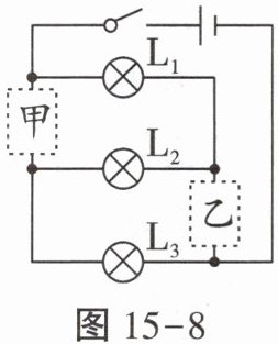 8.(2024巴蜀中学月考)能能同学手里有三只相同规格的小灯泡,他设计了如图15-8所示的电路,可忘记画上甲、乙两处的电路元件:①若甲、乙是两个开关,即能实现三灯串联又能实现三灯并联;②若甲、乙是两个开关,即能实现三灯同时工作,又能实现$L_1、$$L_2、$$L_3$各自独立工作;③若甲、乙是两只电流表,三灯并联且两表示数相同;④若甲、乙是两只电流表,两表示数的关系是2I甲= 3I乙;⑤若甲、乙是两只电流表,三灯串联且两表示数相同。其中说法中正确的是(