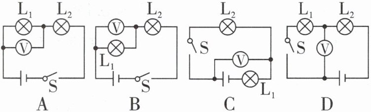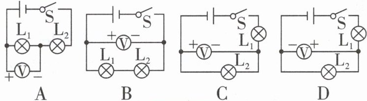 例3 下列能正确测出灯泡$L_2$两端电压的电路是 (