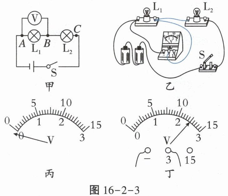 (3)在实验过程中,第一小组同学发现连接好电路,闭合开关S后,指针偏转情况仍然如图16-2-3丙所示,原因是_____。排除故障后,他们测得灯$L_1$两端的电压,电压表示数如图16-2-3丁所示,则灯$L_1$两端的电压是_____V。在测量灯$L_2$两端的电压时,他们打算采用以下方法:电压表所接的B接点不动,断开A接点改接到C接点上,此操作可能会导致电压表出现的情况是_____。重新正确操作后,测得灯$L_2$两端的电压是_____V。