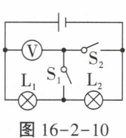 4. 如图16-2-10所示的电路,当$S_1$闭合、$S_2$断开时,电压表的示数为2.5V;当$S_1$断开、$S_2$闭合时,电压表的示数为6V,则此时灯$L_2$两端的电压为