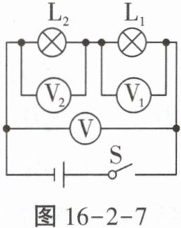 例3 (1)在如图16-2-7所示的电路中,闭合开关后电压表$V_1$的示数为2.5V,V的示数为4.5V,则电路的电源电压为_____V,灯$L_2$两端的电压为_____V。