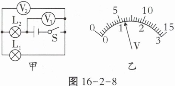 (2)如图16-2-8甲所示的电路,当闭合开关后,灯泡$L_1$和$L_2$都发光,这时两只电压表的指针偏转角度相同,指针位置均如图16-2-8乙所示,则$L_1$两端的电压为$_____V,L_2$两端的电压为_____V。