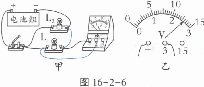 (3)电路连接正确后进行实验,某小组分别测出小灯泡$L_1、$$L_2$两端的电压和并联电路的总电压,电压表示数相同,如图16-2-6乙所示,其值为_____V。根据这组数据,该小组得出并联电路中电压的规律,你认为实验的疏漏之处是_____。纠正后得到并联电路中的电压规律为_____。