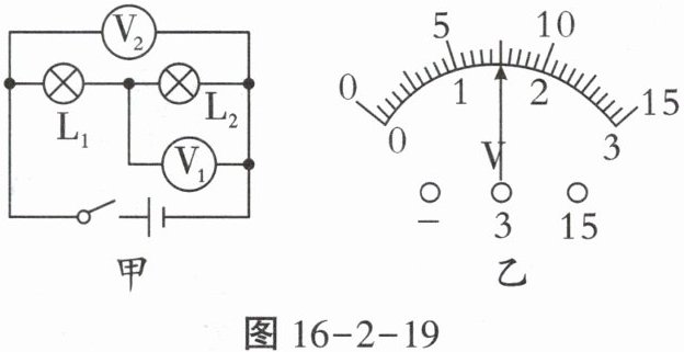 9. 如图16-2-19甲所示的电路,当开关闭合后,电压表$V_1、$$V_2$的指针偏转均如图16-2-19乙所示,则$L_1$两端的电压为