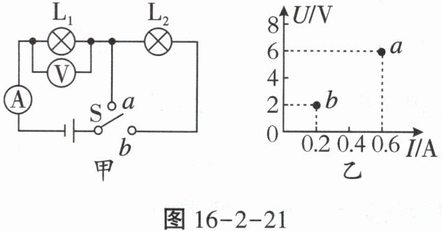 11. 如图16-2-21甲所示,当开关S由接点a转到接点b时,电压表示数和电流表示数的变化情况如图16-2-21乙所示,则开关S在接点b时,灯泡$L_1$两端的电压是