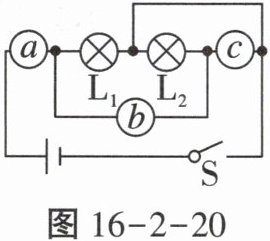 10.(2024重庆一中月考)如图16-2-20所示$,L_1$和$L_2$两个灯泡并联,a、b、c三个电表(可能是电流表或电压表)的示数依次为1.5、1.0、2.0(单位为V或A),则灯泡$L_1$两端的电压为