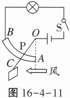 9. 一位同学设计了一个风力测定仪,如图16-4-11所示,O是转动轴,OC是金属杆,下面连接着一块受风板。无风时,OC是竖直的,风越强,OC杆偏转的角度越大。AB是一段圆弧形电阻,P点是金属杆与弧形电阻的接触点,电路中接有一个小灯泡。测风力时,闭合开关S,金属杆OC与弧形电阻AB结合在一起相当于一个