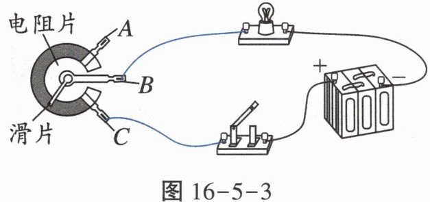 如图16-5-3所示,请选择电位器A、B、C三个接线端其中的两个连入电路中,要求顺时针旋转滑片时,灯泡变暗。