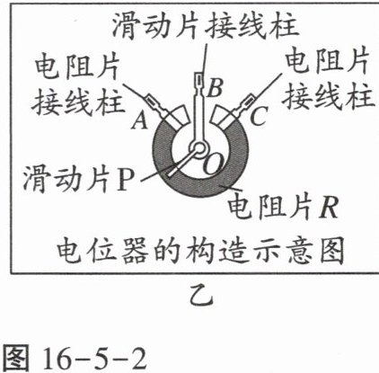 2. 电位器的工作原理:如图16-5-2乙所示,电位器是一个变形的滑动变阻器。通过改变连入电路中电阻片的