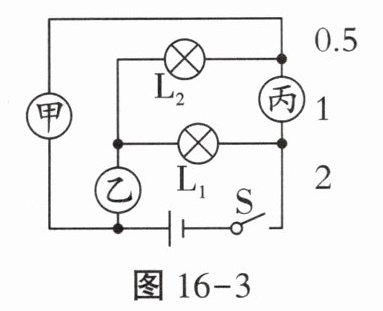 5. 如图16-3所示的电路,开关S闭合时,规格相同的灯泡$L_1、$$L_2$均能发光,图中甲、乙、丙为电表,粗心的小明在读数时只在纸上记录了如图所示的数字,下列说法中正确的是(