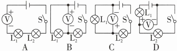 4. 下列电路中,S闭合后,电压表测$L_2$两端电压的电路是(