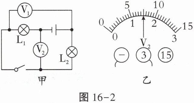 4. 如图16-2甲所示的电路,电源由4节新干电池串联而成,开关闭合后,电压表$V_2$的示数如图16-2乙所示,则灯$L_1$两端的电压为