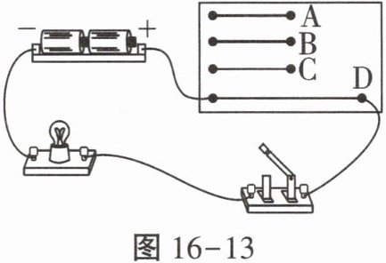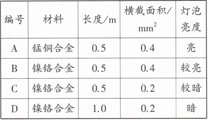 15. 小鹏想“探究影响导体电阻大小的因素”,在实验中他使用四根电阻丝,其材料规格如下表所示。编号材料长度/m横截面积/mm^2灯泡亮度A锰铜合金0.50.4亮B镍铬合金0.50.4较亮C镍铬合金0.50.2较暗D镍铬合金1.00.2暗(1)实验中,电路如图16-13所示,分别将电阻丝接入电路中,观察_____来比较电阻的大小。(2)为探究导体电阻与导体材料的关系,应控制_____和_____相同,用材料不同的导体进行实验。(3)分别将编号为B、C的电阻丝接入电路进行实验,可得出结论:导体的电阻大小与导体的_____有关。(4)分别将编号为_____的电阻丝接入电路进行实验,可得出结论:导体的电阻大小与导体的长度有关。(5)实验过程中小鹏更换电阻丝后,发现灯泡的亮度变化不明显,可在电路中串联_____(选填“电流表”或“电压表”)来增强实验效果。(6)小鹏在实验中将D电阻丝对折后其阻值为R,与C电阻丝的阻值$R_C$相比,R_____$R_C$(选填“>”“<”或“=”)。