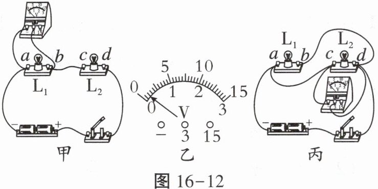 14. (2025巴蜀中学期末)小虹和小明用小灯泡探究“串联电路和并联电路的电压规律”。(1)闭合开关前电压表示数如图16-12乙所示,其原因是电压表_____。处理好问题后,小虹用电压表分别测电源两端的电压和小灯泡L_1、L_2两端的电压,每次拆接电压表时,开关应处于_____状态。(2)小虹利用同一电源多次实验记录的实验数据如下表,由表中数据可得:在串联电路中,电压的规律是_____(用表中字母U、$U_1$、$U_2$表示)。实验次数电源两端电压(U/V)L_1两端电压($U_1$/V)L_2两端电压($U_2$/V)12.81.21.622.81.41.432.80.82.0(3)如图16-12甲所示,测量小灯泡L_1两端的电压之后,_____(选填“能"或“不能”)只将电压表接a点的导线改接到d点测L_2两端的电压。(4)小虹将电压表分别并联接在如图16-12丙所示电路中的ab、cd和ad两端,测出一组数据后得出并联电路的电压规律。小明说这样的结论不具有普遍性,接下来的操作应该是_____。(5)细心的小明发现,同一小灯泡L_1在图甲、丙两电路中的亮度不同,L_1接在图_____(选填“甲”或“丙”)电路中会更亮些。