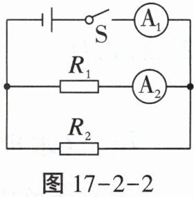 例4 (2024重庆)将阻值为10Ω的电阻$R_{1}与另一电阻R_{2}$接入电源电路,如图17-2-2所示。闭合开关S,电流表A_1的示数为0.45A,电流表A_2的示数为0.3A。求:(1)通过$R_{2}$的电流;(2)电源电压。_____