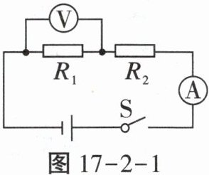 例3 如图17-2-1所示,电源电压保持不变,$R_{2}$的阻值为20Ω,闭合开关后,电压表的示数为2V,电流表的示数为0.2A。求:(1)$R_{1}$的阻值;(2)电源电压。_____
