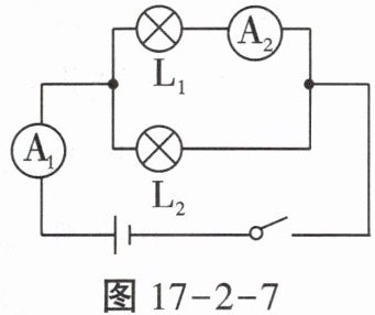 7.(2024滨州)如图17-2-7所示的电路,电源电压为3V,闭合开关后,电流表$A_1$的示数为0.6A,电流表$A_2$的示数为0.2A,则通过灯泡$L_2$的电流为