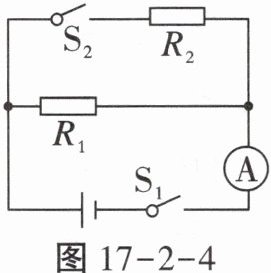 6. 如图17-2-4所示,电源两端的电压U保持不变。闭合开关$S_{1}$、$S_{2}$,电流表示数为2A。闭合开关$S_{1}$,断开开关$S_{2}$,电流表示数为1.5A。已知电阻$R_{1}= 10\Omega$,求:(1)电源两端的电压U;(2)电阻$R_{2}$的阻值。_____