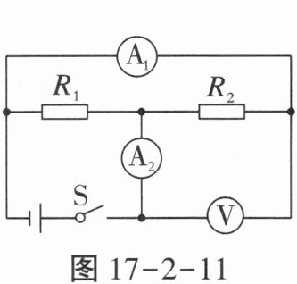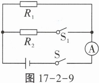 9. 如图17-2-9所示的电路,已知电阻$R_{1}$的阻值为20Ω,假定电源电压保持不变。只闭合开关S时,电流表的示数为0.15A;开关S和$S_{1}$均闭合时电流表的示数为0.21A。求:(1)电源电压U的大小;(2)电阻$R_{2}$的阻值。_____