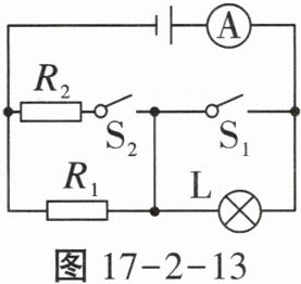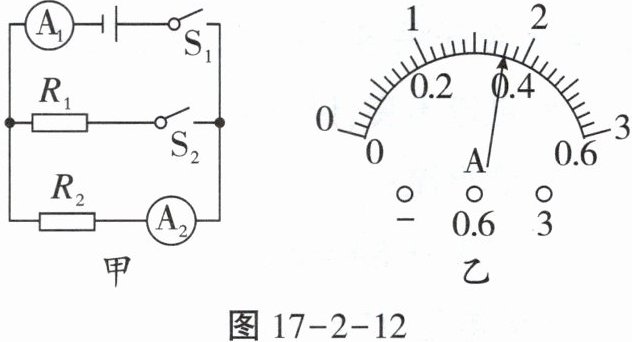 13. 如图17-2-12甲所示的电路,开关$S_{1}$、$S_{2}$闭合后,两电流表的指针均指在同一位置,示数如图17-2-12乙所示,则通过$R_{1}$的电流为