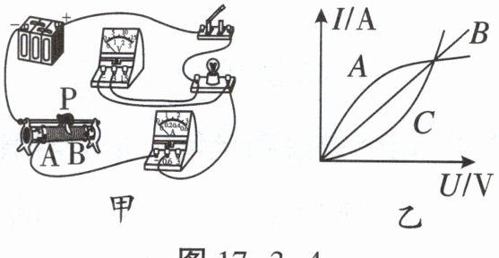 (2)若滑动变阻器的滑片P移至某处时,电压表示数为2.2V,为测得小灯泡正常发光时的电阻,应将滑片向_____(选填“A”或“B”)端移动。多次实验后,小江由下表的数据做出的灯泡I-U图像是图17-3-4乙中的_____(选填“A”“B”或“C”)。