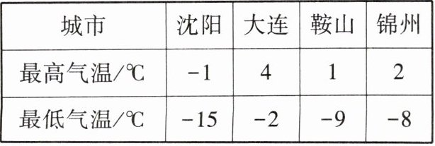 答案 沈阳 解析 沈阳的温差为$-1 - (-15) = 14(^{\circ}C)$, 大连的温差为$4 - (-2) = 6(^{\circ}C)$, 鞍山的温差为$1 - (-9) = 10(^{\circ}C)$, 锦州的温差为$2 - (-8) = 10(^{\circ}C)$, $6 < 10 < 14$, 故沈阳的温差最大.