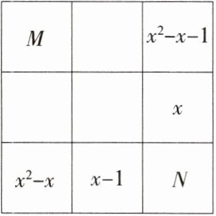 解析 设最中间的代数式为 $P$,由题意可得 $(x^{2} - x) + (x - 1) + N = (x^{2} - x) + P + (x^{2} - x - 1)$,所以 $P = -x^{2} + 2x + N$,所以第一列中间的代数式为 $(x^{2} - x) + (x - 1) + N - (x - x^{2} + 2x + N) = 2x^{2} - 3x - 1$,因为第一列的三个代数式之和 = 第三行的三个代数式之和,所以 $M + (2x^{2} - 3x - 1) + (x^{2} - x) = (x^{2} - x) + (x - 1) + N$,化简,得 $M - N = -2x^{2} + 4x$.