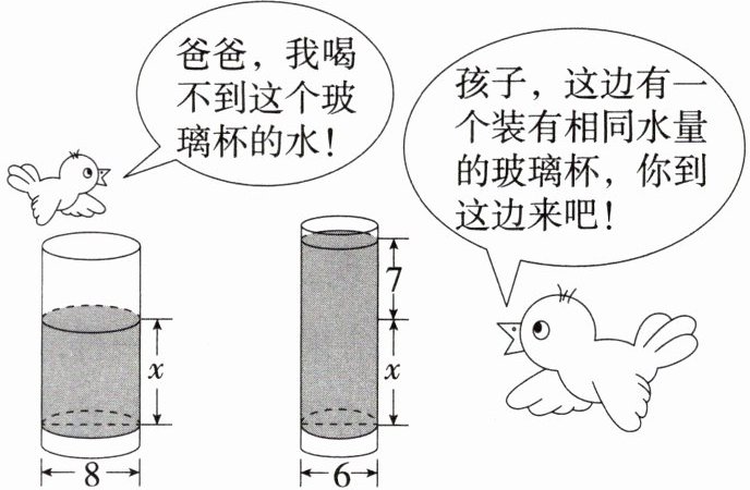 解析 圆柱的体积 = 底面积×高,圆柱的底面是圆,圆的面积等于 $\pi r^2$.根据两个玻璃杯中水量相等可列方程.