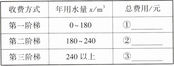 元。(2)设某户居民的年用水量为$x(m^3),$用含x的代数式表示x位于不同的阶梯时,相应的总费用。