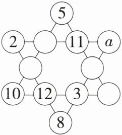 2.「2025江苏西交大苏州附中月考」在一堂充满探索与创意的“幻方”与“幻圆”活动课上,一个小组的同学挑战了一项任务:他们将1,2,3,4,5,6,7,8,9,10,11,12这12个数字填入“六角幻星”图中.这个图的魅力在于,它的每条边上的四个数字之和必须完全相同.如图,部分数字已经被填入图中的圆圈内,请你确定a的值为 (
