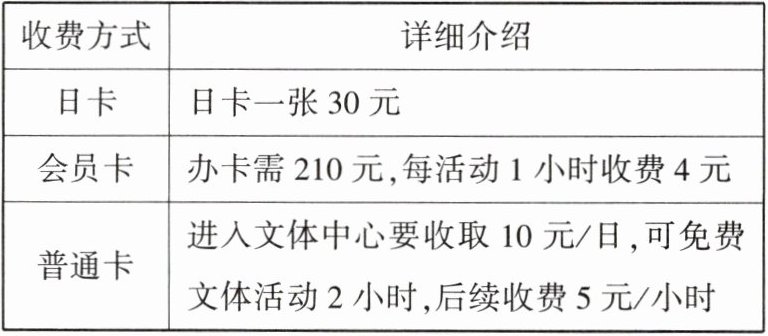 ____元.(2)小明打算一个月(30天)都去文体中心活动,每天活动的时间为x小时(x为正整数,且$x≥2$).