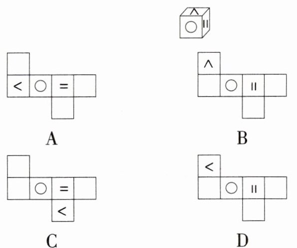 D 由原正方体知,带图案的三个面相邻,通过折叠后A不符合,且B,C折叠后图案的位置不符,所以展开后能得到的图形是D.故选 D.