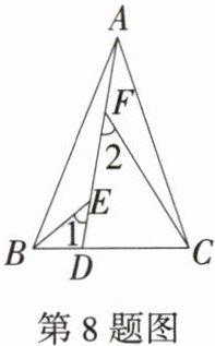 8. 「2025河北沧州质检」如图,在$△ABC$中,$AB= AC,AB>BC$,点 D 在边 BC 上,$CD= 2BD$,点 E,F 在线段 AD 上,几何画板演示$∠1= ∠2= ∠BAC$,若$△ABC$的面积为 18,则$△ACF与△BDE$的面积之和为(