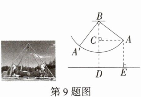 9. 「2025广东东莞期中」海盗船是一种模拟海盗冒险场景的游乐项目.如图,当海盗船静止时,转轴 B 到地面的距离$BD= 15m$.当海盗船的船头在 A 处时,$AC⊥BD$,此时测得点 A 到地面的距离$AE= 9m$.当船头从 A 处摆动到$A'$处时,$A'B⊥AB$,则点$A'$到 BD 的距离为____.