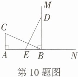 10.「2025山东临沂月考」如图,$CA ⊥ AB$,垂足为点 A,射线$BM ⊥ AB$,垂足为点 B,$AB = 15\mathrm{cm}, AC = 6\mathrm{cm}$.动点 E 从 A 点出发以$3\mathrm{cm}/s$的速度沿射线 AN 运动,动点 D 在射线 BM 上,随着 E 点的运动而运动,始终保持$ED = CB$.若点 E 的运动时间为$t\mathrm{s}(t > 0)$,则当以 B,E,D 为顶点的三角形与$\triangle ACB$全等时,$t = $____.