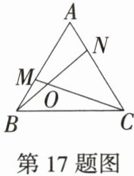 17.「2025 广东汕头期末」如图,等边$\triangle ABC$中,点 M,N 分别在 AB,AC 上,且$BM= AN$,连接 CM,BN 交于点 O,则$∠BOC$的度数为______