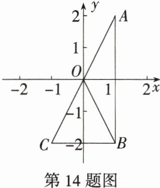 14. 如图,x 轴是$\triangle AOB$的对称轴,y 轴是$\triangle BOC$的对称轴,点 A 的坐标为$(1,2)$,则点 C 的坐标为______