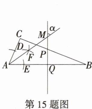 15. 新考向「2025 山东青岛育才中学质检」如图,在$Rt\triangle ABC$中,$∠C= 90^{\circ },∠B= 20^{\circ }$,PQ 垂直平分 AB,垂足为 Q,交 BC 于点 P.按以下步骤作图:①以点 A 为圆心,以适当的长为半径作弧,分别交边 AC,AB 于点 D,E;②分别以点 D,E 为圆心,以大于$\frac {1}{2}DE$的长为半径作弧,两弧相交于点 F;③作射线 AF,与直线 PQ 交于点 M.若 AF 与 PQ 的夹角为 α,则$α=$______$^{\circ }$.