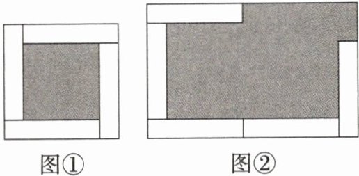 C 设每个白色长方形的长为 $ a $,宽为 $ b $,由题图①可得 $ ( a + b ) ^ { 2 } - 4 a b = 35 $,即 $ a ^ { 2 } + b ^ { 2 } = 2 a b + 35 $,由题图②可得 $ ( 2 a + b ) ( a + 2 b ) - 5 a b = 102 $,即 $ a ^ { 2 } + b ^ { 2 } = 51 $,$ \therefore 2 a b + 35 = 51 $,$ \therefore a b = 8 $,故每个白色长方形的面积为 8。