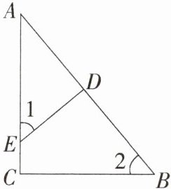 4.学科教材特色变式如图,点E是$\triangle ABC$中AC边上的一点,过E作$ED⊥AB$,垂足为D,若$∠1= ∠2$,则$\triangle ABC$是(