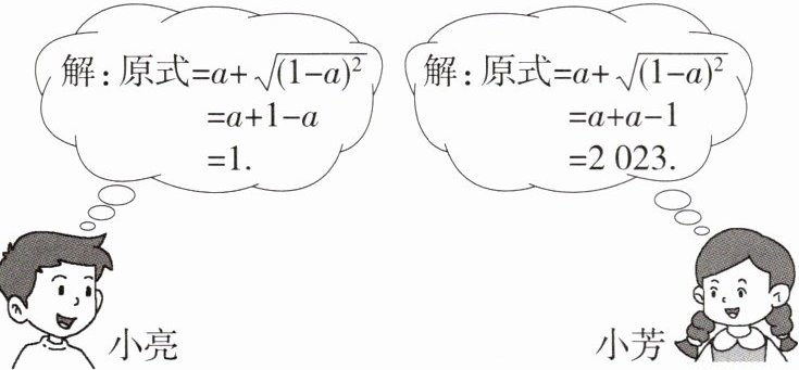 16.「2025山西晋城二模,★☆」求代数式$a+\sqrt {1-2a+a^{2}}$的值,其中$a= 1012$。下图是小亮和小芳的解答过程: