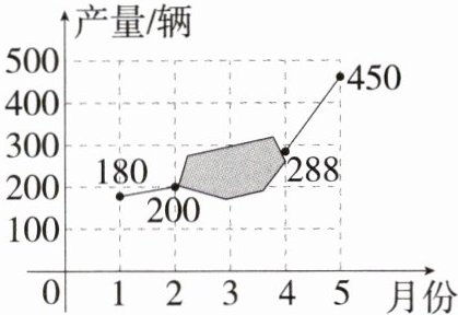 1~5月份的自行车产量统计图如图所示,3月份的自行车产量数据不小心被墨汁覆盖。若2月份到4月份该厂家自行车产量的月平均增长率都相同,则3月份自行车产量为(